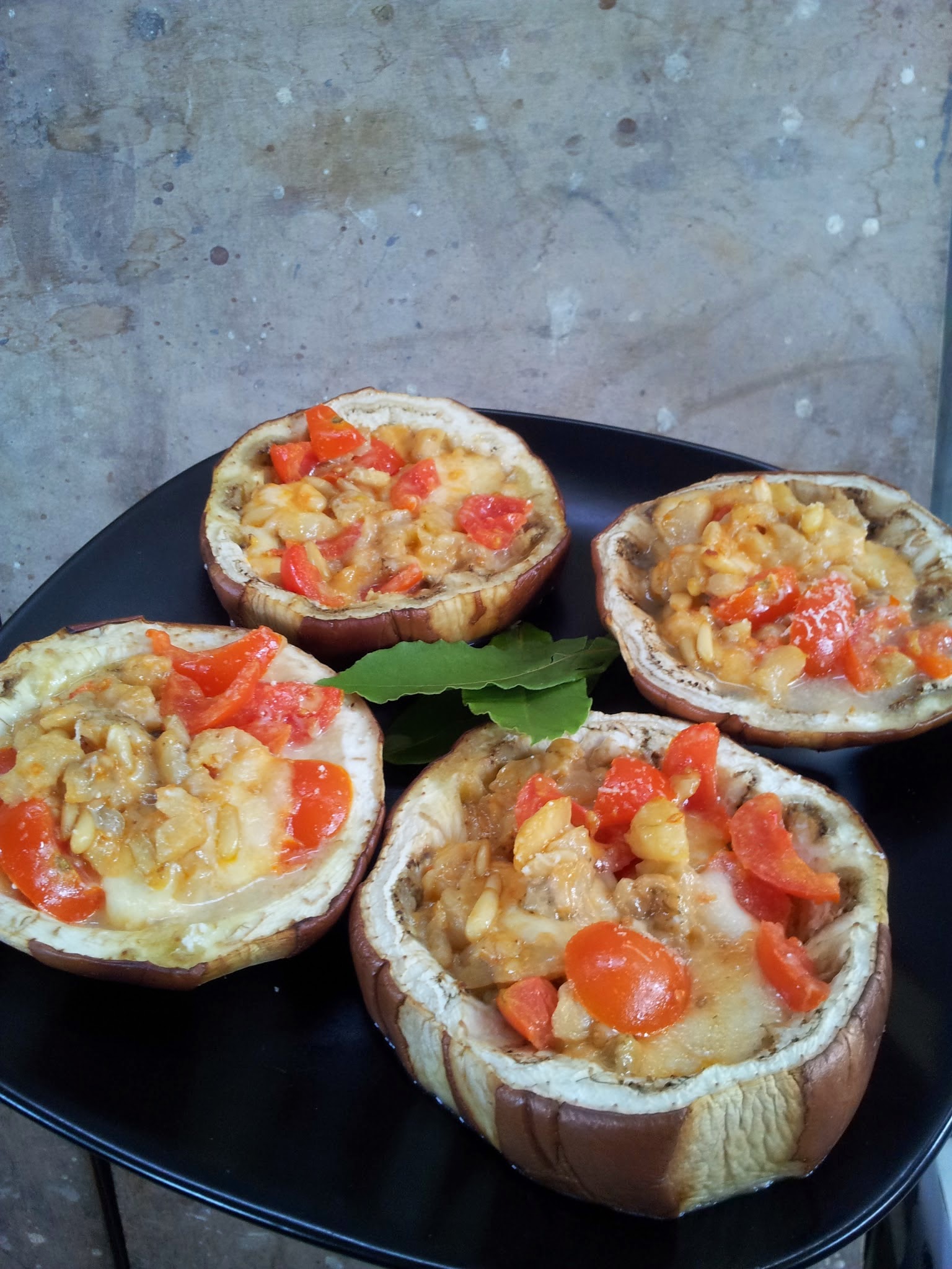 Sbollenta 6 fogli sottili di lasagna, riempi con melanzane e mozzarella, arrotola e disponili in pirofila, su carta da forno oliata. Condisci con olio extravergine, fiocchetti di burro e scaglie di parmigiano e inforna 15-20'.
