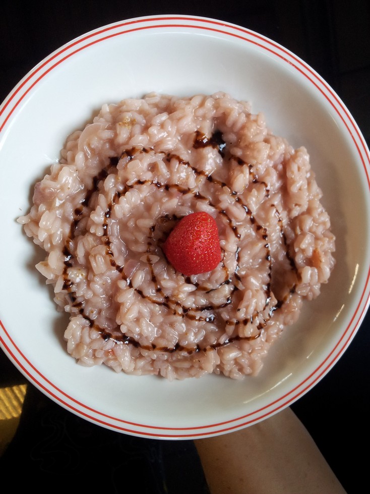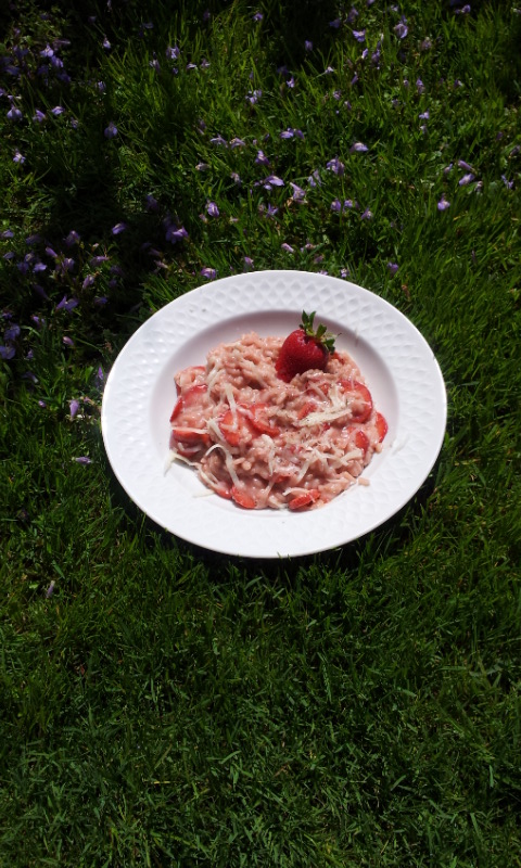 Una ricetta che ho assaggiato per la prima volta in campeggio, a Cesenatico, negli anni '80. C'era il cugino di mio padre che la mattina ci mandava tutti in spiaggia perché voleva essere libero di cucinare il risotto "alla come mi pare". Quando tornavamo, dentro potevano esserci salsiccia o fragole o mele o frutti di mare o melone. Io ne ero letteralmente deliziata così ancora oggi cerco di ripeterli, specie quello alle fragole. il mio preferito.