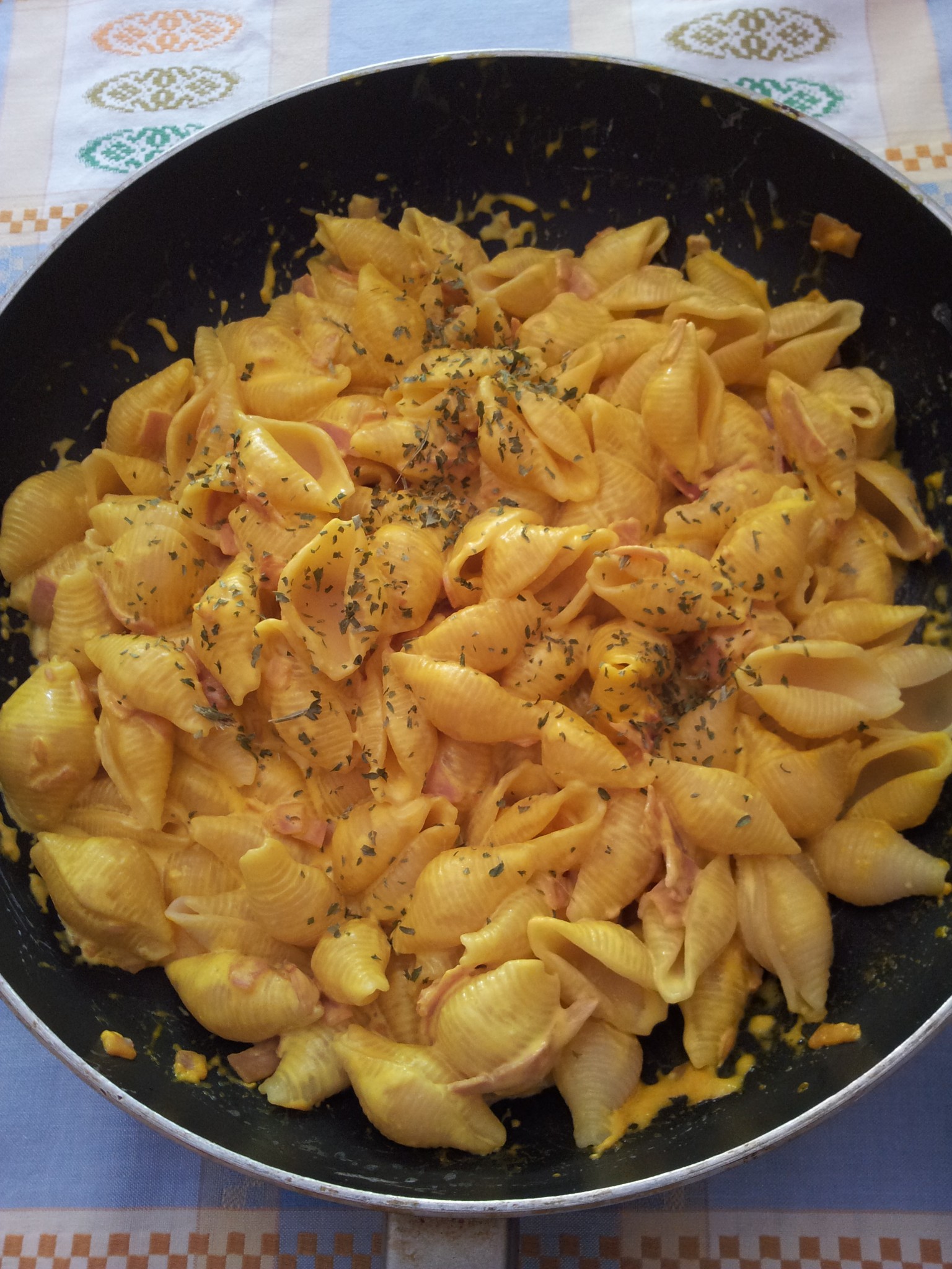 Cuoci in padella 2 cucchiai di olio extravergine, 100g di prosciutto cotto ben tritato, 200g di philadelphia, 2 bustine di zafferano (sciolte in 4 cucchiai di latte) e 200g di conchiglie lessate...poi completa con prezzemolo tritato.
