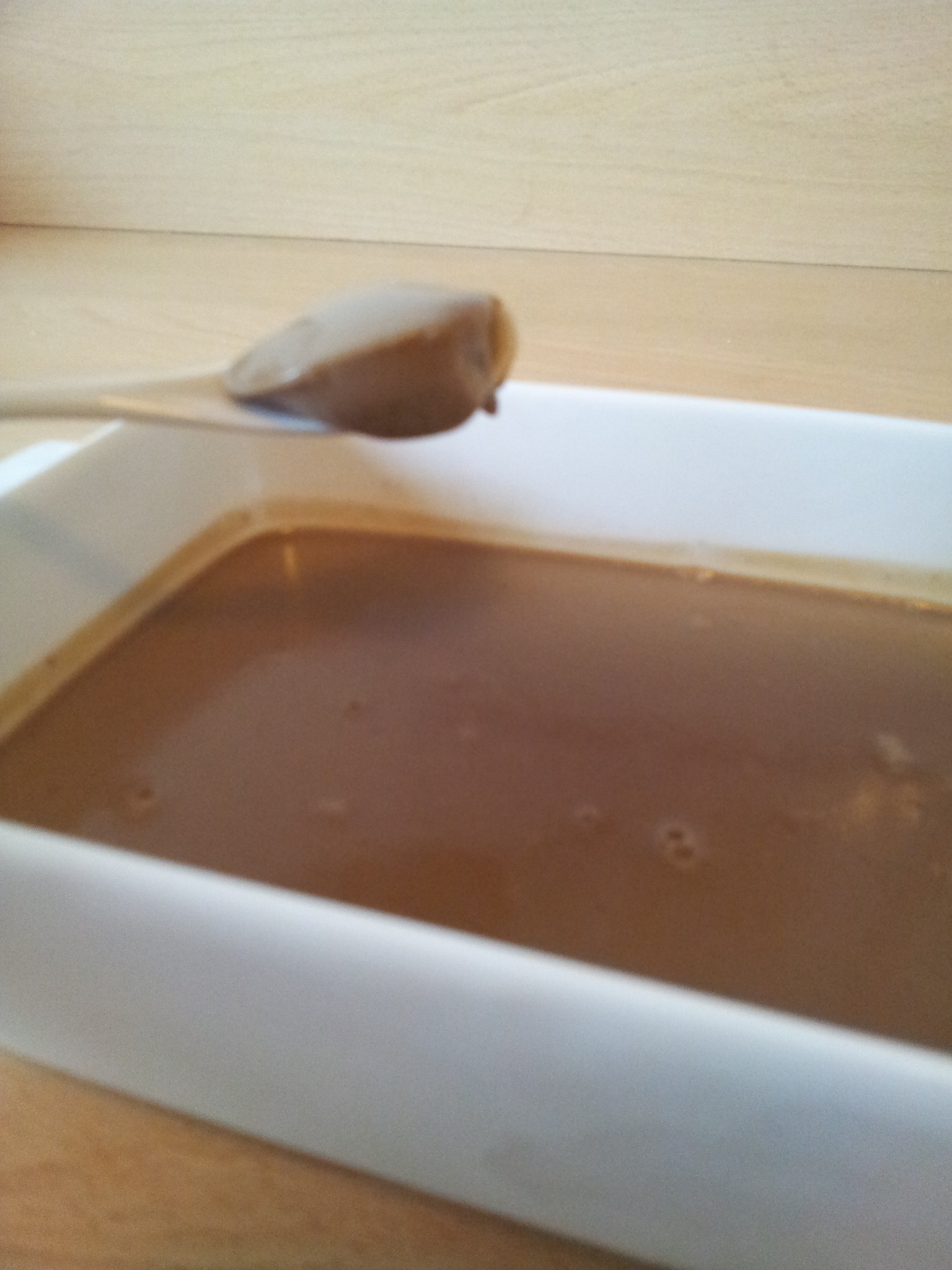 Cuoci a fuoco bassissimo 120ml di panna fresca, 1 cucchiaino di caffè solubile, scorza di arancia grattugiata e 30g di zucchero; ti ci vorranno circa 15', senza far bollire. Aggiungi poi 2g di colla di pesce (ammollata in acqua fredda e strizzata) e lascia riposare in frigorifero. La ricetta di Daniela Guaiti diceva 6h ma io ho deciso tutta la notte.
