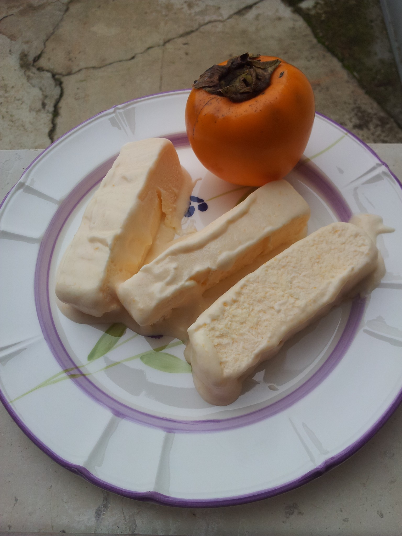 Pela 1kg di cachi e schiaccia la polpa in un colino; aggiungi succo di 1 limone, 400g di zucchero e 500ml di panna ben montata. Versa in un contenitore e lascia in freezer almeno 1 notte.