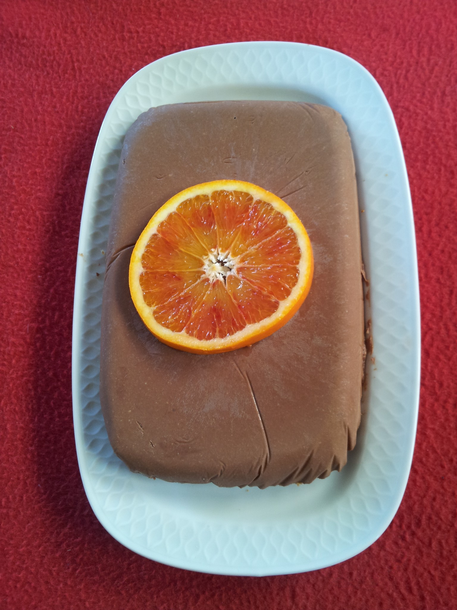 Un'ora prima di servirlo rovescialo sul piatto, togli la pellicola e decora con una fetta di arancia fresca.