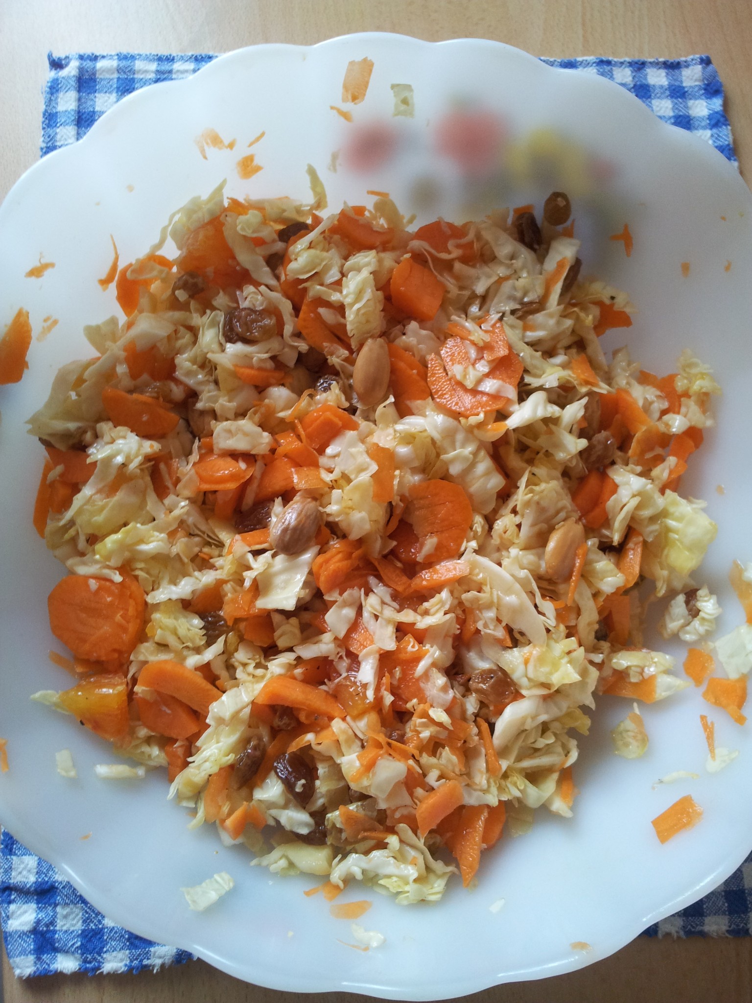 In un'insalatiera capiente mescola 250g di verza bianca tagliata a listarelle fini, 250g di carote (io ho usato la mandolina) e spicchi di 1 arancia pelati a vivo.