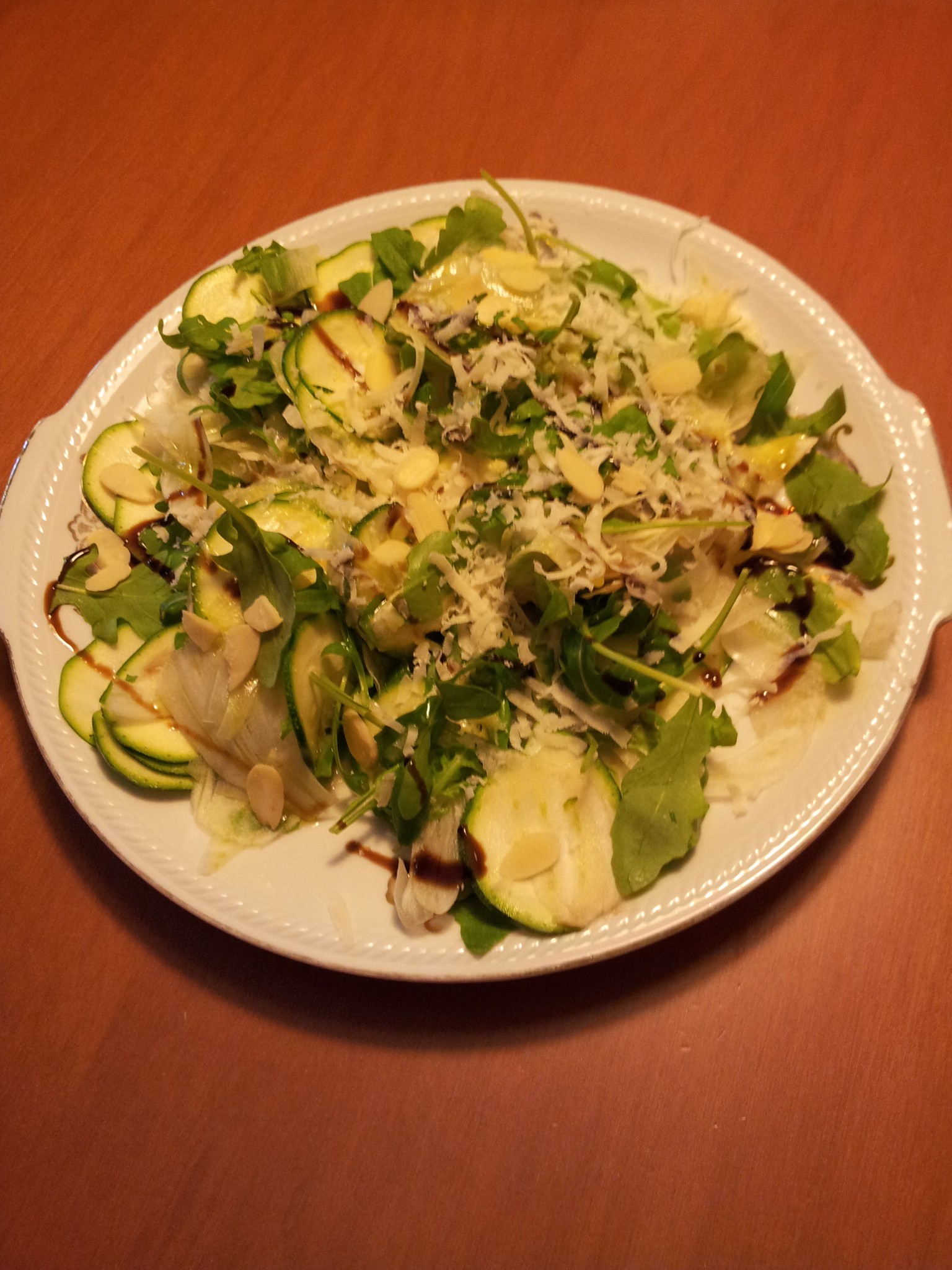 Non ci sono dosi perché dipendono dal numero dei commensali e dai gusti personali e dall'uso...servono solo la mandolina, con cui tagliare sottili zucchina e finocchio (per la lunghezza o a rondelle) e le mani, con cui spezzare la rucola.