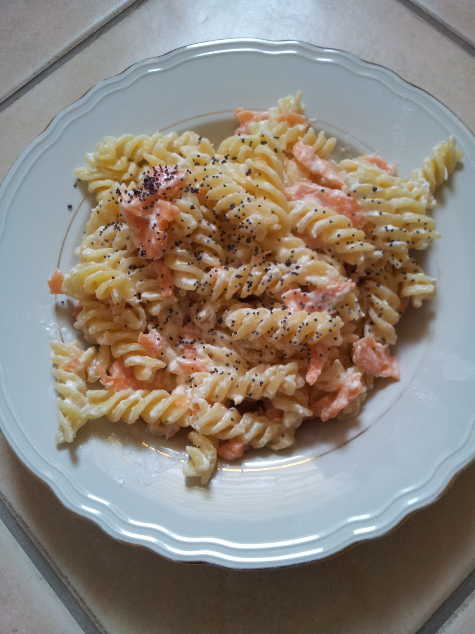 Fai saltare la pasta scolata con il salmone affumicato a pezzetti e la cremina.