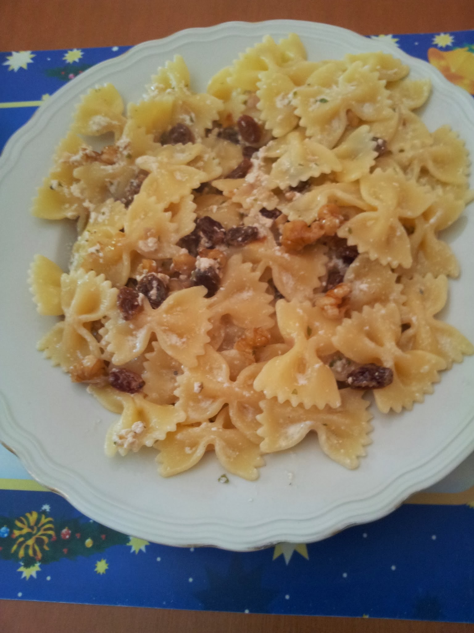 In padella rosola 1 cipolla tritata nel burro, aggiungi noci spezzettate e uva sultanina e spegni il fuoco appena il composto assume un bel colore tostato. Aggiungi prezzemolo tritato, 1 vasetto di yogurt bianco, noce moscata grattugiata, sale e la pasta.