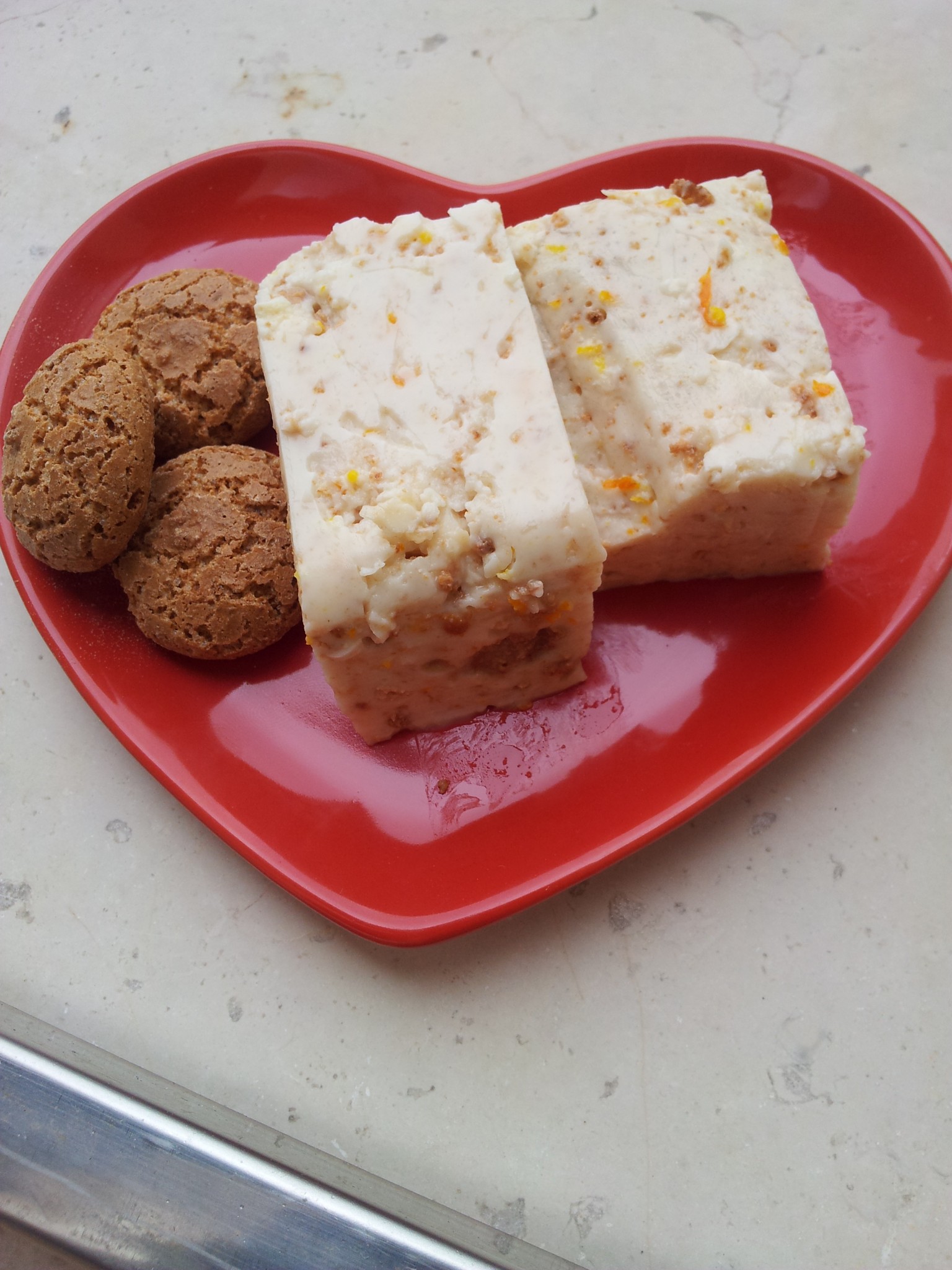 In una ciotola mescola 500g di yogurt intero, 75g di zucchero a velo, scorza di 1 arancia, grattugiata, il liquore e amaretti sbriciolati.