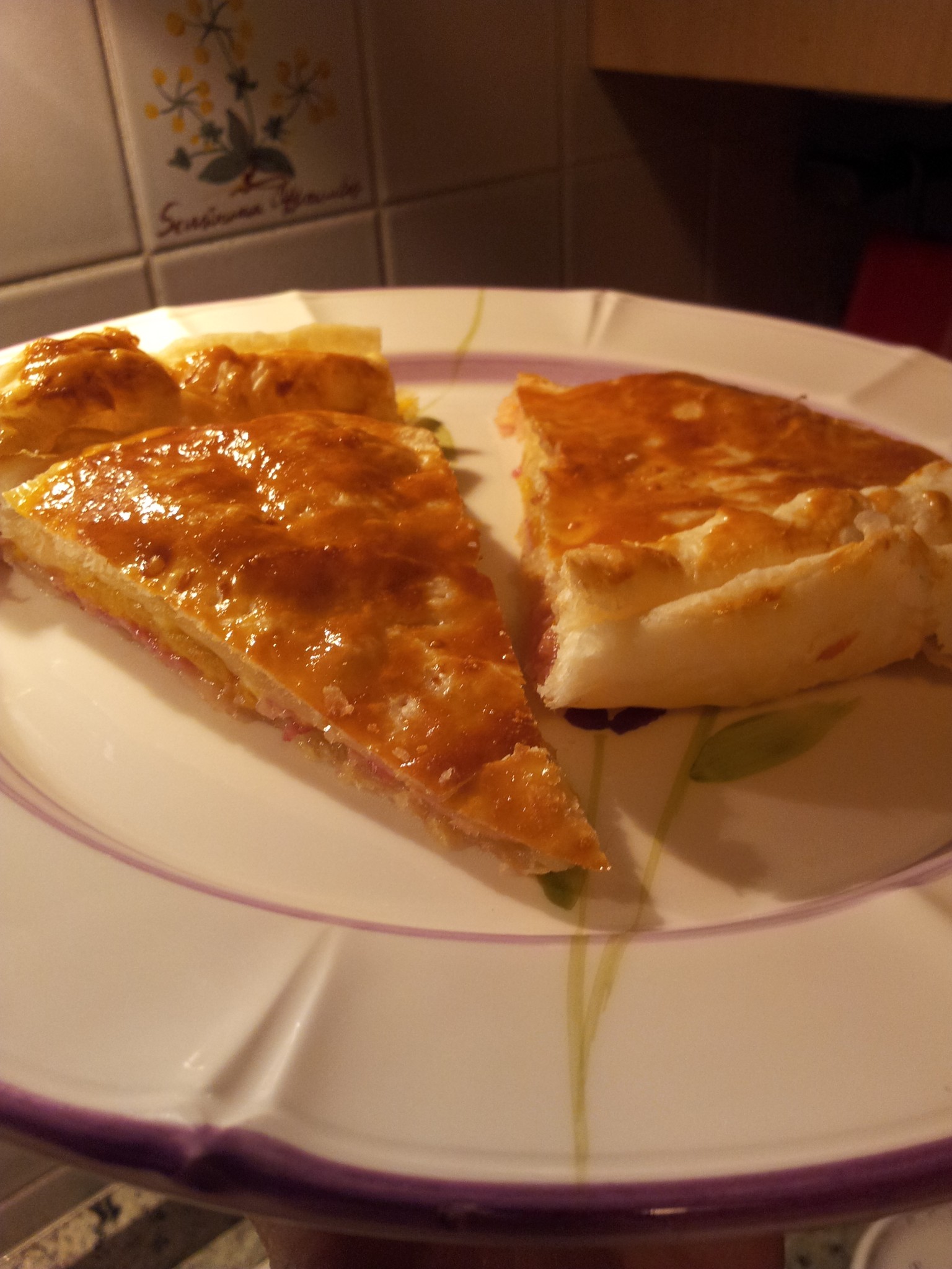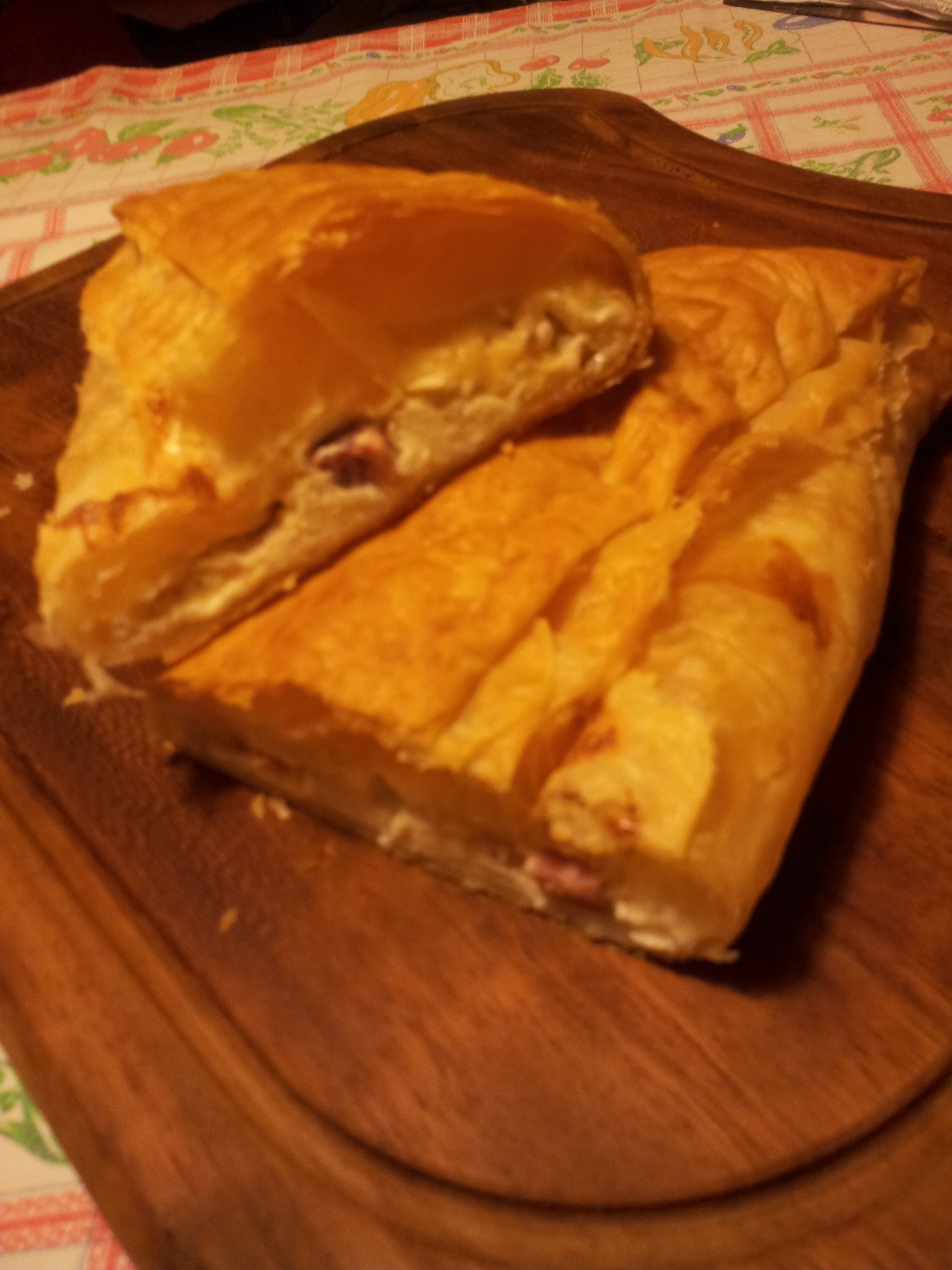 Stendi una confezione di pasta sfoglia rettangolare e, lasciando 4-5cm di lato liberi, farcisci con 200g di ricotta, 4 sottilette a pezzettini e 100g di prosciutto cotto (se è a fette, dividi la ricotta così da spalmarla ovunque - io avevo i cubetti).