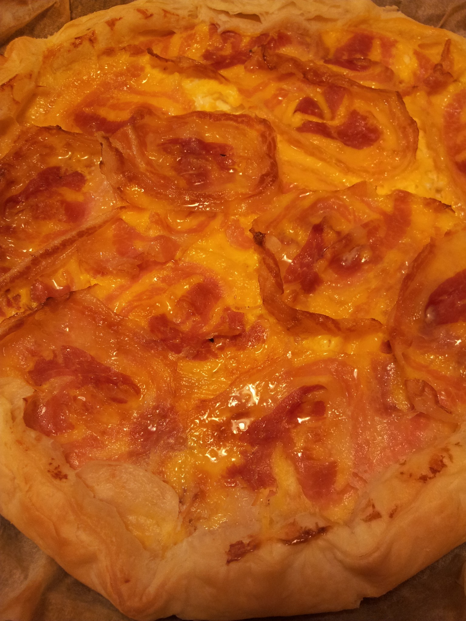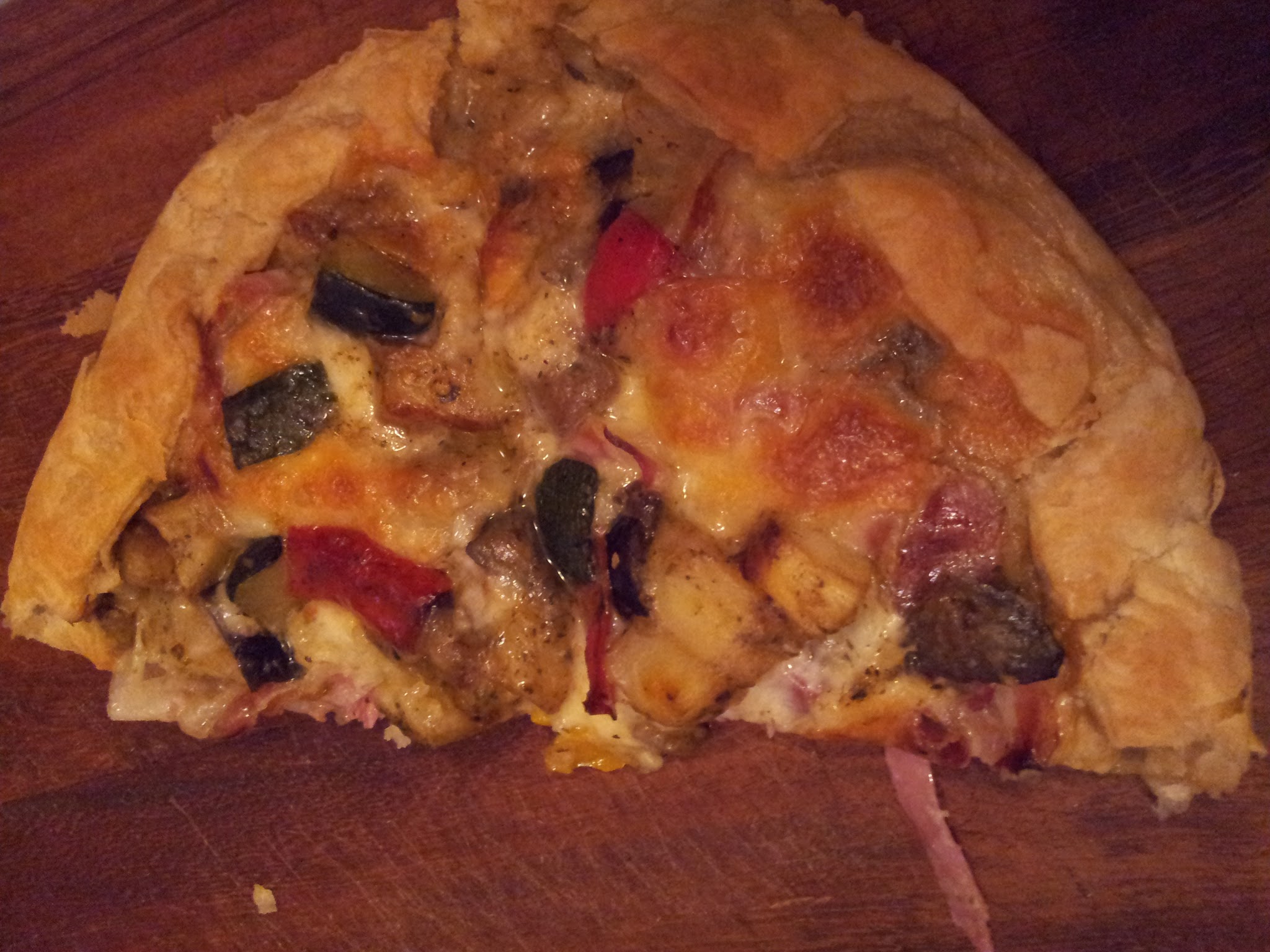 La mia versione comprende dunque pasta sfoglia, pangrattato (che metto sempre nei tortini perché l'acqua del formaggio morbido non bagni troppo il fondo e difatti così facendo mi rimane sempre bello croccante), prosciutto cotto, mozzarella, verdure grigliate (avevo una di quelle confezioni solo da scaldare), pancetta, un'altra mozzarella e altre verdure...e forno a 180°C per 30' circa.