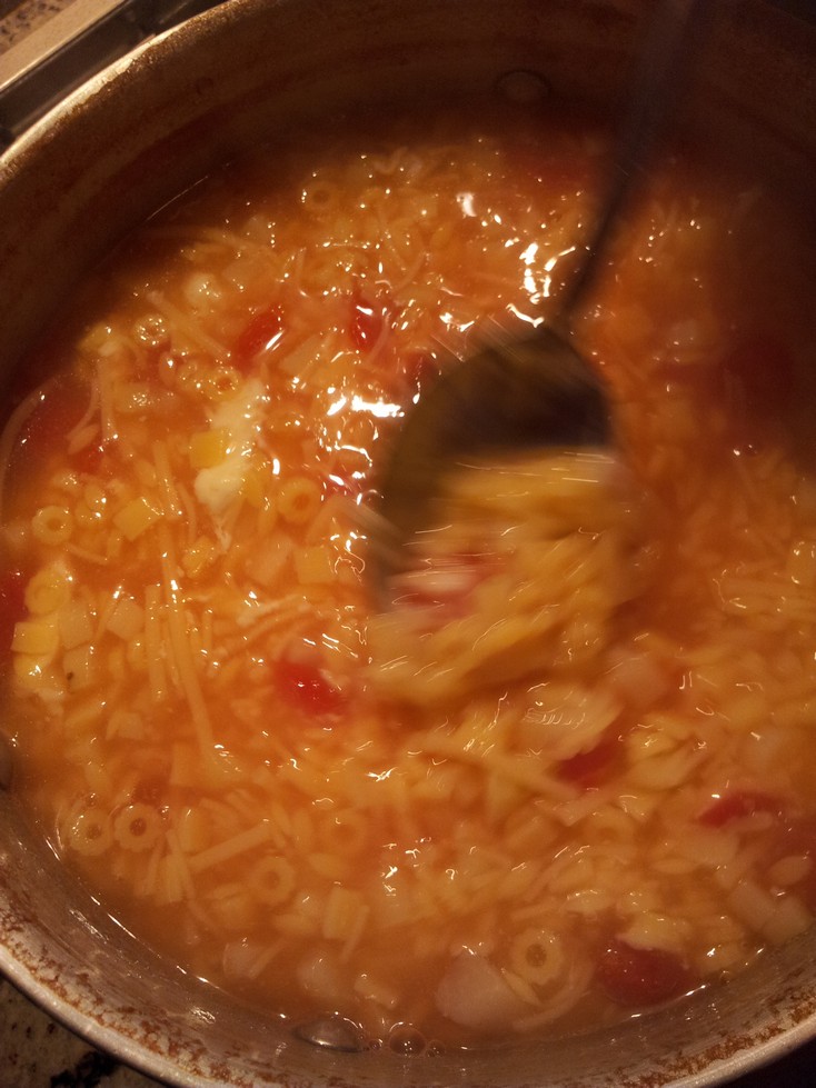 Fai bollire l'acqua e aggiungi il sale, 250g di pasta mista (io ho usato anellini, risi, quadretti, spaghetti spezzati e tagliolini), le patate e i pomodori. Lascia cuocere per 20', controllando di sale a metà cottura. A fuoco spento aggiungi 120g di formaggio a cubetti (secondo Borghese provola affumicata, secondo me un misto tra emmental e Pecorino Monte Cusna...tanto per metterci un po' di "reggianità"!) e 50g di parmigiano grattugiato e lascia riposare, col coperchio, per 5-10'. Il tempo giusto per lasciar amalgamare i sapori, completati da una spolverata finale di pepe. Così da gustare una minestra corposa ma ancora brodosa, che riscalda e nutre. A Napoli come in Emilia!