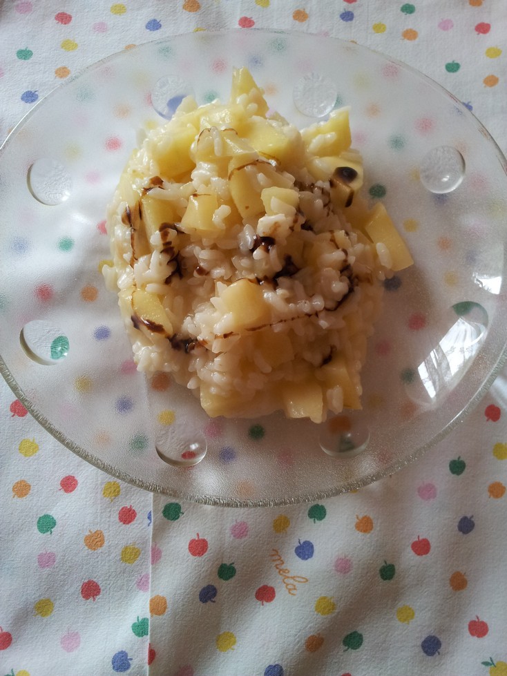Rosola un pezzetto di cipolla tritata in olio e burro, aggiungi 250g di riso Carnaroli, sfuma con 1 bicchiere di vino bianco secco e prepara il risotto aggiungendo brodo vegetale caldo e, a cottura, altro burro e le mele.