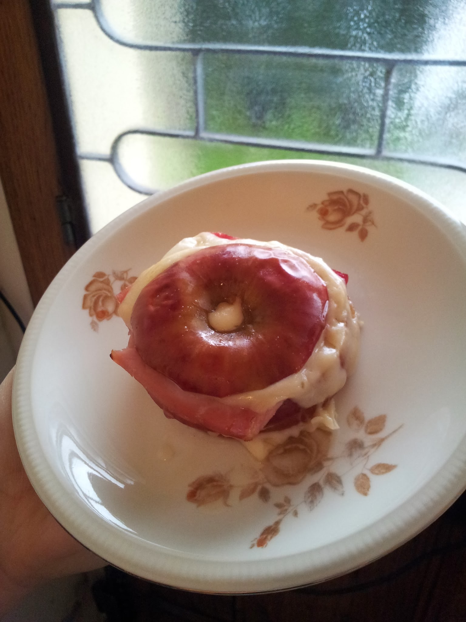 Il dolce della mela ben si abbina con l'affumicato del prosciutto...e per questo penso che la provola forse avrebbe disequilibrato i sapori e io ho scelto l'emmental...ma..de gustibus...!