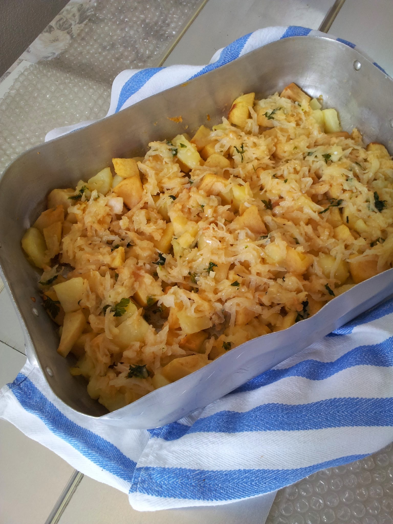 Nel frattempo grattugia un'altra patata e un'altra mela, aggiungi prezzemolo tritato, parmigiano grattugiato, altro olio, sale e, se ti piace, anche del pangrattato. Versa sulla "base", completa con fiocchetti di burro e inforna per altri 10'.