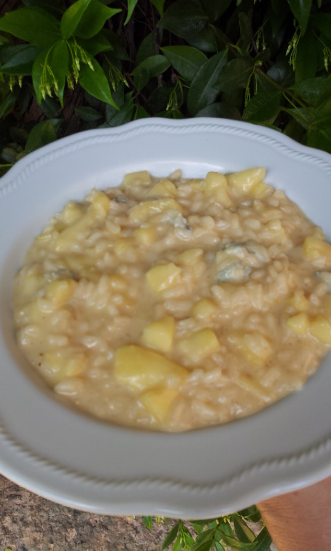 In un tegame rosola uno scalogno tritato nel burro, aggiungi 200g di riso, sfuma con 200ml di vino bianco secco e completa la cottura con il brodo vegetale. Aggiungi le mele e 150g di gorgonzola e spolvera con pepe.