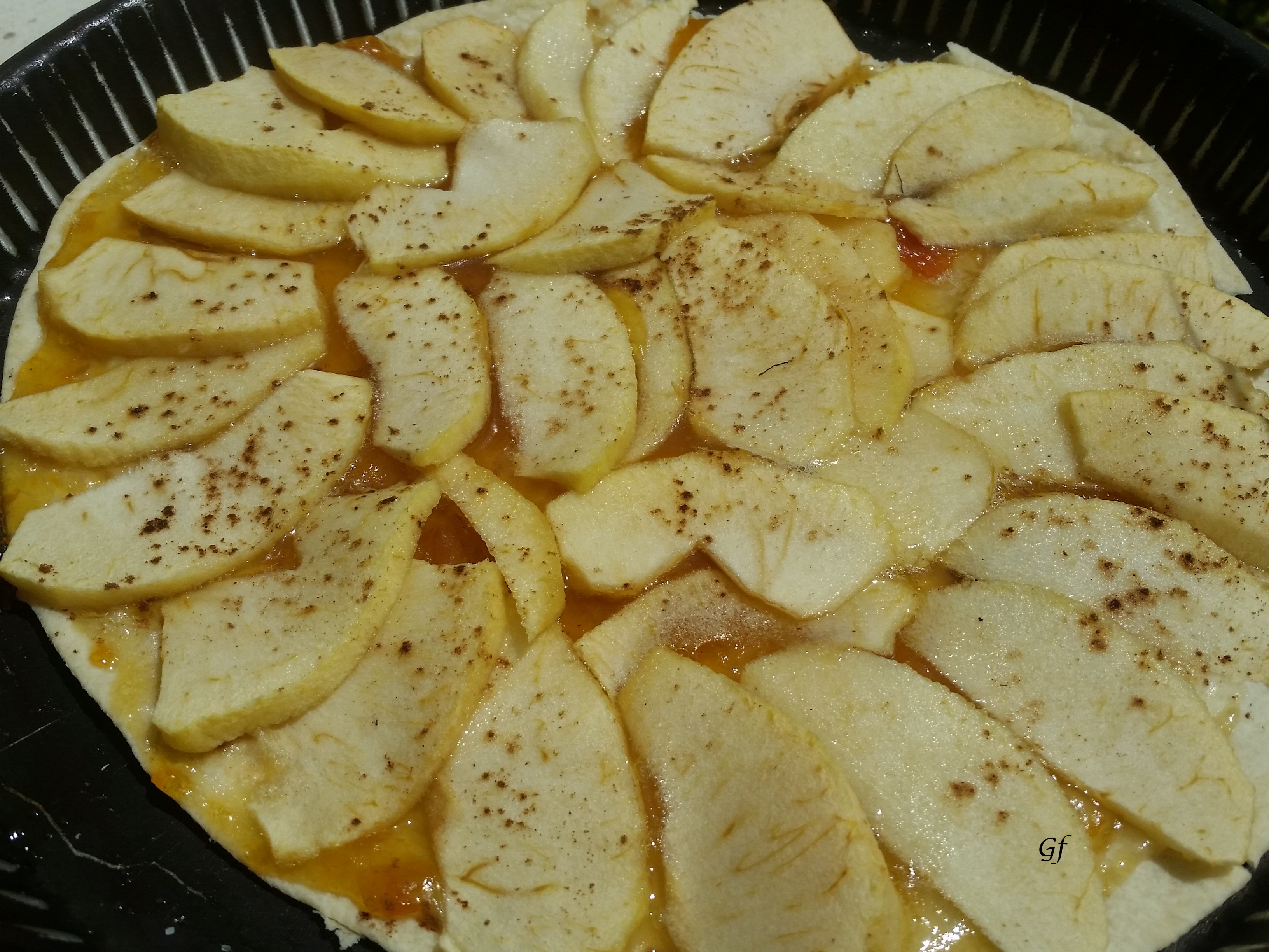 In una tortiera imburrata metti una piadina, spalmala bene di confettura di albicocche, coprila di fettine di mela, zucchero, cannella e fiocchetti di burro e inforna per 20'.