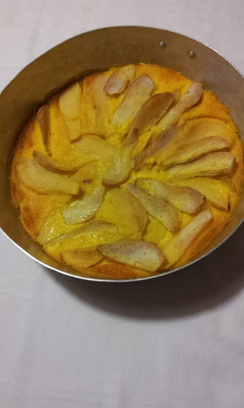 Versa in una teglia imburrata e infarinata e ho copri con fettine di mela Golden (a me 1 è bastata). E poi in forno per 1h.